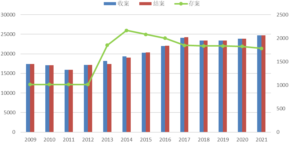 2021年,我院共受理各类案件24,694件,较2020年上升8.47%;连同存案共审结24,696件,较2020年上升8.33%;存案1,783件,较2020年减少2件;结收比100.01%,圆满完成全年审判任务。3件案例被《最高人民法院公报》刊载,公报案例累计60件,保持全国法院领先地位。连续4年荣获全国法院学术讨论会组织工作先进奖。15篇案例分析在2021年全国法院系统优秀案例分析评选中获奖,其中一等奖1篇,二等奖8篇,三等奖3篇,优秀奖3篇,创建院以来历史最好水平。1篇裁判文书荣获第四届全国法院“百篇优秀裁判文书”。