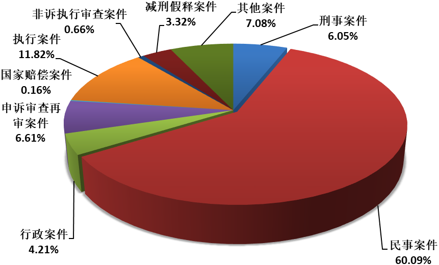 在2021年审结的各类案件中,按照审级划分,一审案件占6.16%,二审案件占63.77%,再审案件占0.42%。按照案由划分,民事案件占60.09%,刑事案件占6.05%,行政案件占4.21%,申诉审查再审案件占6.61%,国家赔偿案件占0.16%,执行案件占11.82%,非诉执行审查案件占0.66%,减刑假释案件占3.32%,其他案件占7.08%。