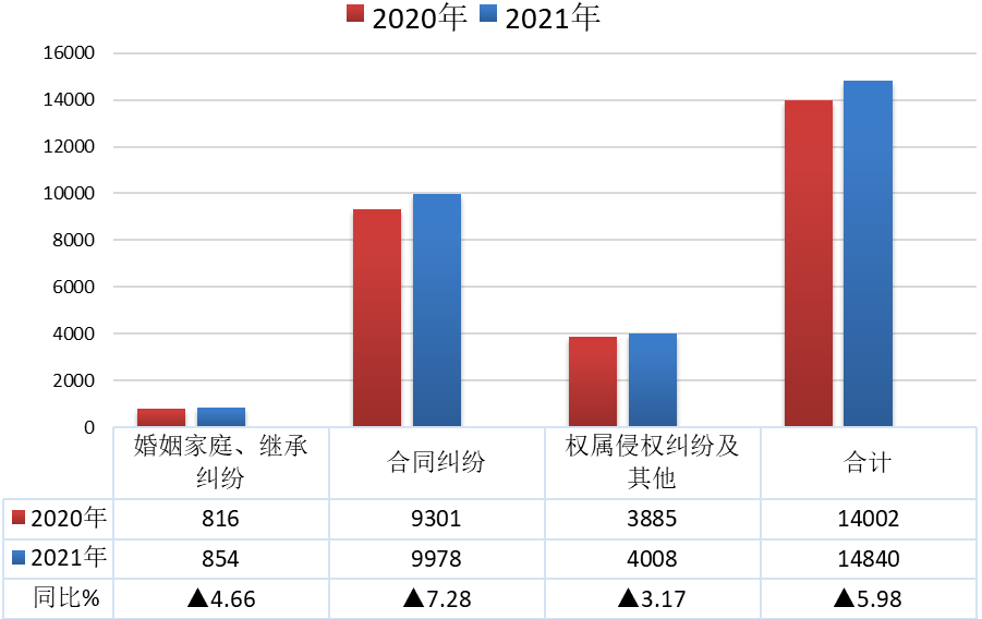 全年共受理各类合同纠纷案件9,921件,同比上升6.41%;连同存案审结9,978件,同比上升7.28%;诉讼标的额共计106.22亿元,同比下降31.66%。受理婚姻、家庭和继承案件866件,同比上升7.05%;连同存案审结854件,同比上升4.66%;诉讼标的额共计4.99亿元,同比上升23.76%。受理财产权属确认、人身损害、宅基地纠纷等权属、侵权案件4,017件,同比上升3.66%;连同存案审结4,008件,同比上升3.17%;诉讼标的额共计54.61亿元,同比上升66.88%。