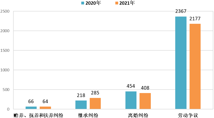 ——依法审理涉民生案件。依法审理教育、医疗、住房、婚姻家庭等领域矛盾纠纷案件,妥善解决事关群众切身利益的问题。审结民法典施行后全市首例经法院生效法律文书设立并登记居住权案件、首例性骚扰损害责任纠纷案件,取得良好社会反响。审结“为父奔丧被辞退”案,维护中华传统美德。审结吴声威隐私权和个人信息保护纠纷上诉案等案件,加强公民人格权保护。全年共审结劳动争议案件2,177件,离婚纠纷案件408件,继承纠纷案件285件,分家析产纠纷案件52件,涉及赡养、抚养和扶养纠纷的案件64件,同居关系纠纷案件9件,婚约财产纠纷案件4件,探望权纠纷15件,收养关系纠纷6件,其他婚姻家庭纠纷11件。