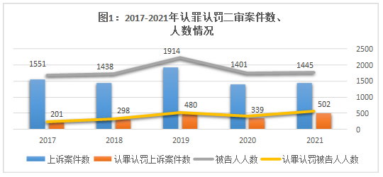 2017-2021年,上海二中院共审结二审案件7749件,涉及被告人9169人,其中被告人认罪认罚的1820件,涉及被告人2044人,认罪认罚二审案件数及被告人人数分别占二审案件总数及被告人总人数的23.5%、22.3%。在上述1820件案件中,认罪认罚抗诉案件共15件,占认罪认罚二审案件的0.8%。