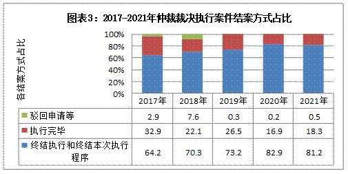 在历年仲裁裁决执行案件结案方式占比中(见图表3),2017年执行终结率为64.2%,2018年执行终结率为70.3%,2019年执行终结率为73.2%,2020年执行终结率为82.9%,2021年执行终结率为81.2%。总体来看,仲裁裁决执行案件以终结执行或终结本次执行程序方式结案的案件数量占有较大比重,且五年内占比增幅较高,呈现逐年上升趋势。其中,在很多终结执行案件中,被执行人同样存在无财产可供执行或有财产但难以处置的情形。由此可见,仲裁裁决执行案件在规定时间内很难执行完毕。