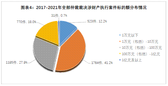 对于财产类执行案件,通过对我院2017-2021年财产类仲裁首执案件标的额分布情况的统计分析可见(见图表4和5),标的额在10万元以下的案件数量占比超五成;2017-2021年标的额为1万元~10万元区间的案件数量分别为135件、130件、356件、470件、673件,总体呈大幅上升趋势,标的额1亿元以上案件数量基本保持稳定,其余区间的案件数量总体波动不大,与各年仲裁裁决执行案件收案量上升趋势基本保持一致。