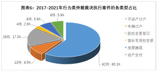 对于行为类执行案件,经统计,2017-2021年共受理153件行为类执行案件,其中2017年受理22件行为类执行案件,2018年31件,2019年39件,2020年26件,2021年35件。可见,行为类仲裁裁决执行案件只占极小部分,且数量变动不大。行为类执行内容主要涉及不动产过户、车辆过户、股权变更登记、房屋腾退、动产交付、商标专用权变更等六类,其中涉及不动产过户案件数量最多,占半数以上(见图表6)。