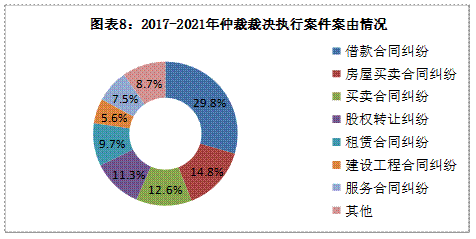 2017-2021年受理的仲裁裁决执行案件中,借款合同仲裁裁决执行案件(含金融借款、民间借贷)最多,共有1306件,占仲裁裁决执行案件总数的29.8%(见图表8)。其中,涉网络平台的民间借贷仲裁裁决执行案件共有1060件,占借款合同纠纷仲裁裁决执行案件总数的81.2%,占仲裁裁决执行案件总数的24.2%。