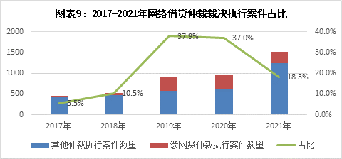 五年里,涉网络平台的民间借贷仲裁裁决执行案件数量增长迅速,2017年有25件,2018年有55件,2019年有351件,2020年有358件,2021年有所回落,为276件。通过对比网络借贷仲裁裁决执行案件的占比情况可发现:2019年和2020年网络借贷仲裁裁决执行案件占全部仲裁裁决执行案件的比重已是2018年的3.6倍(见图表9)。这反映出近年来随着互联网经济的快速发展,网络途径的民间借贷成为个人和小微企业的重要融资手段,但网络借贷纠纷也呈爆发式增长,在仲裁机构对该类案件批量作出生效仲裁裁决后,申请执行人再向我院批量申请强制执行,造成我院首次执行案件大量增加。