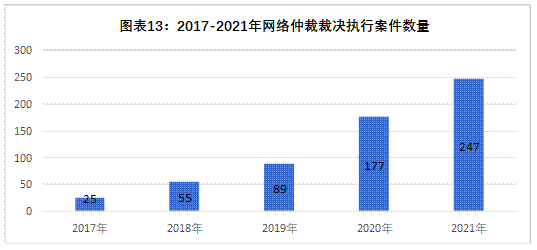网络仲裁是利用互联网等网络技术资源提供仲裁服务的网上争议解决方法。2017-2021年,执行依据为网络仲裁裁决的案件共有593件。其中,2017年有25件,2018年有55件,2019年有89件,2020年有177件,2021年有247件(见图表13)。上述网络仲裁裁决执行案件中,有583件为借款合同纠纷仲裁裁决执行案件,有10件为手机租赁合同纠纷仲裁裁决执行案件。