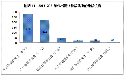 作出上述生效网络仲裁裁决的仲裁机构有:衢州仲裁委员会(278件)、广州仲裁委员会(221件)、湛江仲裁委员会(44件)、萍乡仲裁委员会(20件)、保定仲裁委员会(20件)和宁波仲裁委员会(10件)(见图表14)。由此可见,作出网络仲裁裁决的仲裁机构多集中在东南沿海地区。