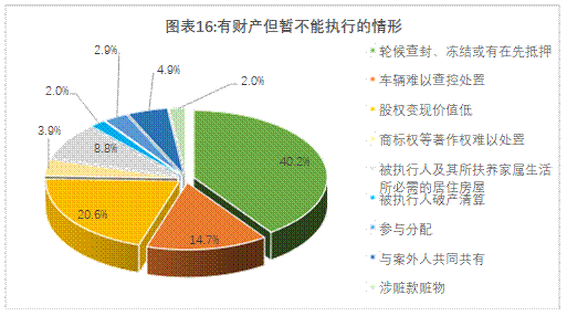 如前所述,以终结本次执行程序方式结案的案件占比较大,可见暂无财产可供执行现象较为普遍。除了被执行人名下确无任何财产的情形外,尚有部分执行案件查询到被执行人名下有财产,但暂不可供执行。经统计,在所抽取的1000件仲裁裁决执行案件样本中,因被执行人名下有财产但暂不能执行而以终结本次执行程序方式结案的有102件。其中,因涉案财产被轮候查封、冻结或设有在先抵押的有41件,占比40.2%;因涉案车辆难以查控处置的有15件,占比14.7%,具体包括车辆难以实际控制、车辆处置耗时长等情形;涉案财产系股权而难以处置的有21件,占比20.6%,包括申请人因股权变现价值低而主动放弃处置、股权未能成功评估等情况;因涉案商标权等著作权难以处置的有4件,占比3.9%;因涉案房屋系被执行人及其所扶养家属生活所必需的居住房屋的有9件,占比8.8%;因被执行人进入破产清算程序的有2件,占比2.0%;因申请执行人参与分配的有3件,占比3.0%;因涉案财产系与案外人共同共有而暂无法处置的有5件,占比4.9%;因执行财产涉嫌刑事案件赃款赃物的有2件,占比2.0%(见图表16)。可见,执行实践中发现了被执行人名下财产但暂不能执行的情形多种多样,也客观反映了财产查控处置的困难和障碍。
