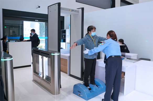 进入大厅南侧大门后的安检服务台配备了高清人脸识别系统,能够通过身份证比对,识别来院参加诉讼或办理立案业务的当事人,经过安检后进入我院。